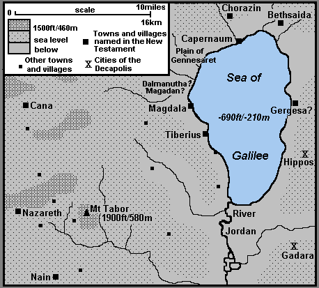 Click here for a map in Jesus's day, including Cana and Nazareth, Jesus's home town where he grew up. Click here for a modern photo of the Sea, taken in the west looking towards the east at its southern end. The sea is actually a freshwater lake, 53 kilometres in perimeter and 210 metres below sea level, very low.
